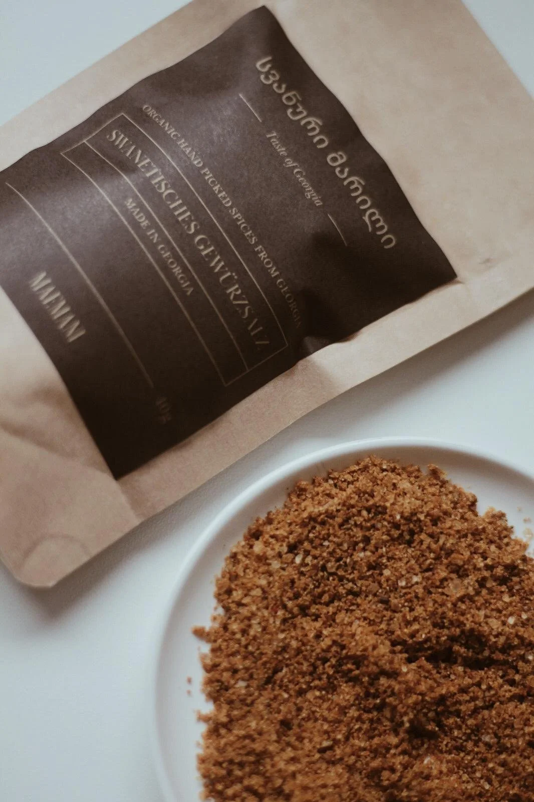 Die Hauptfarben Beige, Weiß und Schwarz ziehen sich durch die komplette Gestaltung. In Verbindung mit Serifenfonts und georgischer Schrift wirkt das Design elegant und zeitlos.